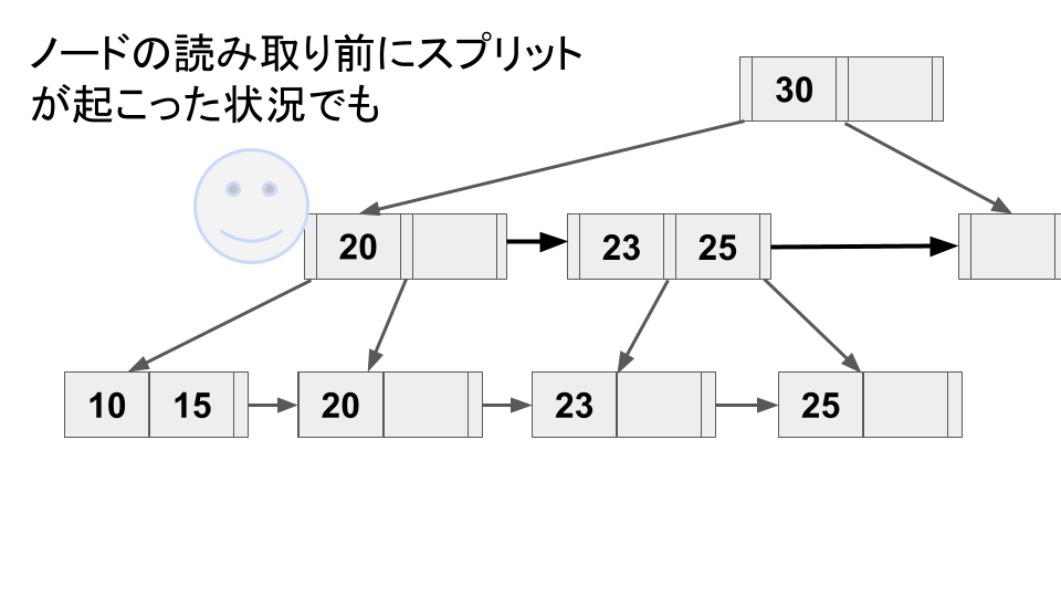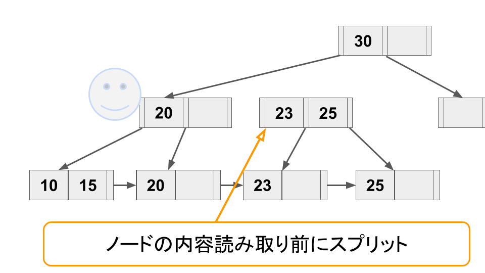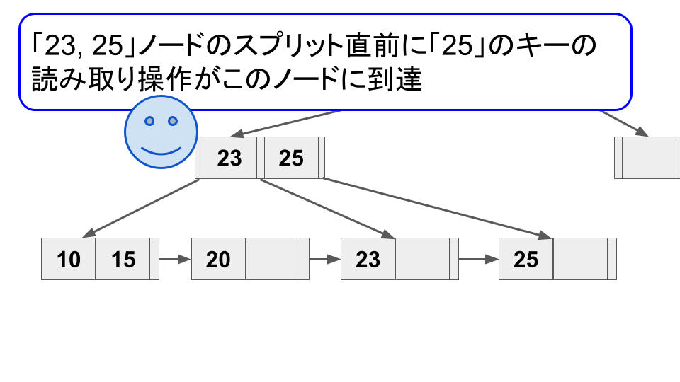 このような状況が起こった場合、読み取り操作は対象のキー(例では「25」)がツリーに無いと勘違いするか、もしくはおかしい状況に気づいたとしても再度ルートから読み取り操作をやり直す必要が出てくる。