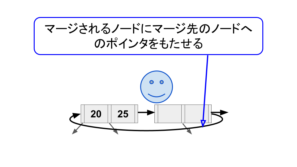 そこでマージされるノードからマージ先のノードへのポインタ(論文では outlink と呼んでいる)を持たせることで、マージが完了していない状態でも、別の読み取り操作を進行できるようにする。