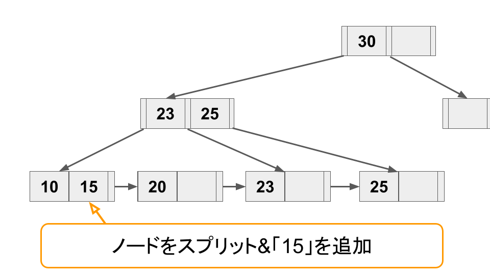 このようにノードのスプリット操作はリーフに留まらず親ノードに伝搬することがある(最悪ルートノードまで伝搬する可能性がある)。