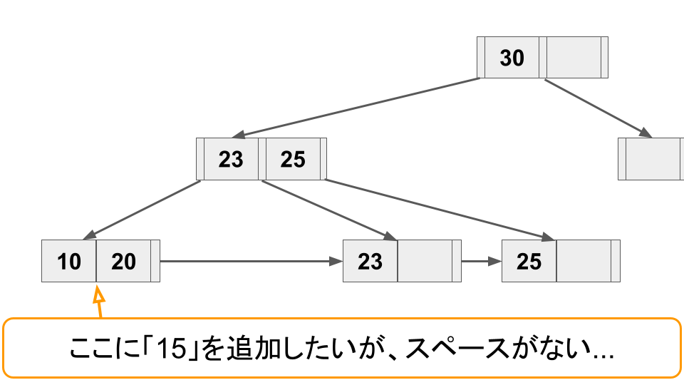 B+ tree では、リーフノードへキー追加時にノードの空きスペースが足りない場合、ノードをスプリットをしてスペースを確保する必要がある。またキーが削除されてノードがスカスカになった場合は逆にノードをマージしてスペースを節約する必要がある。