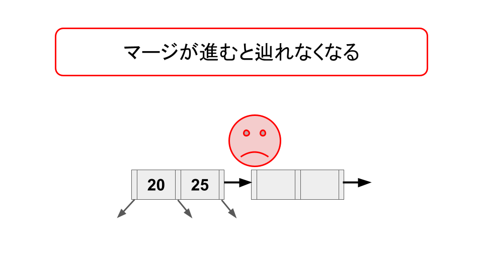 マージ操作を行う場合、マージされる側のノードに到達していた別の読み取り操作に影響が出てくることに対処する必要があるが、