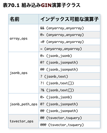 GINインデックスには「GIN演算子クラス」という特定のデータ型に対するインデックスの挙動を定義する仕組みがある。
